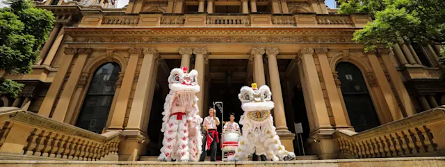 Lion dancing at Sydney Town Hall steps